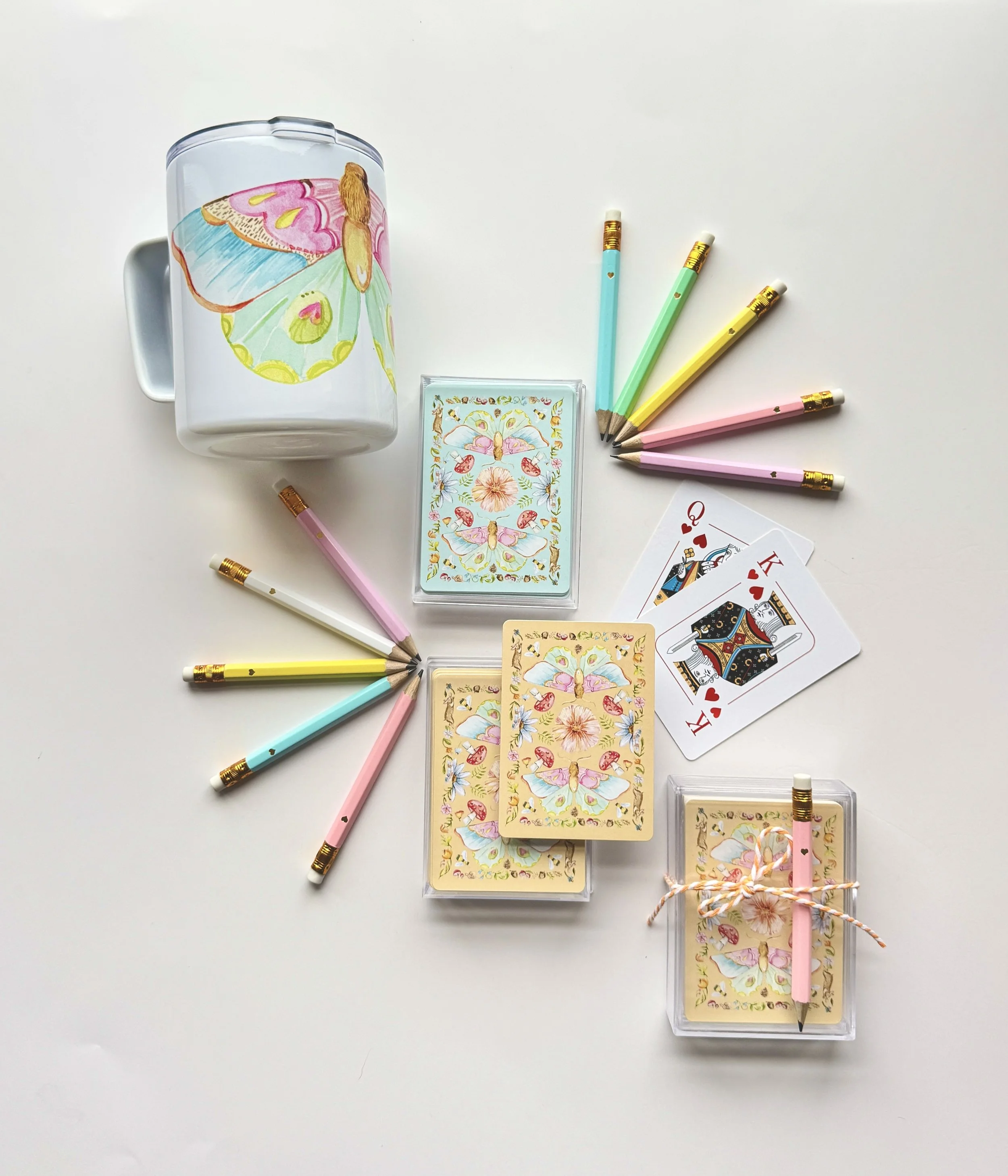 Each deck of cards comes with one colorful mini game pencil adorned with a gold heart.